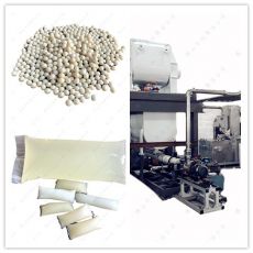 熱熔膠水下切粒機組的工作流程:水下切粒機是將剛從反應釜生產好的熱熔膠(保溫釜)經過螺桿擠出機→換網器→開車閥→特制模頭→通過硬質合金刀片高速旋轉切斷從模頭出來的膠粒,并帶動熔融膠粒高速自轉,在冰水的快速冷卻作用下迅速收縮成球形顆粒,通過有效的冷水管道不斷冷卻,再由水流進入脫水機,在離心脫水機的高速旋轉作用下,水通過過濾網快速甩出,顆粒則被過濾網擋住與高速旋轉的風葉碰撞,由下往上上升至出料口。從脫水機出來后經過一系列的工序,依次不斷循環,客戶所要求的顆粒料就源源不斷地生產出來。