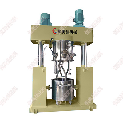 4、設備上裝有低速攪拌部件和高速分散部件,均采用變頻調速可根據不同工藝流程及 不同的粘度進行自我選擇。低速攪拌部件采用行星齒傳動,攪拌漿在公轉時也能自轉使 物料上、下及四周運動,使物料在很短時間內達到理想的混合效果。高速分散部件與行 星架一起公轉,同時高速自轉使物料受到強烈的剪切與分散混合,其效果為普通混合機 的幾倍。