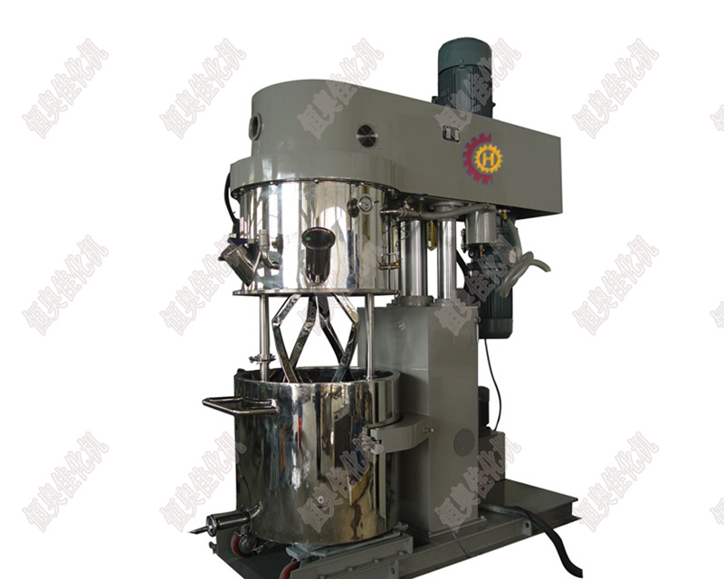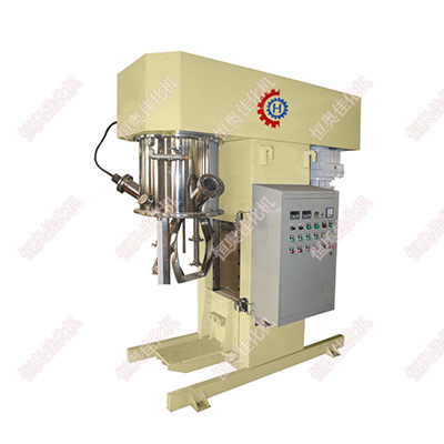 4、設(shè)備上裝有低速攪拌部件和高速分散部件,均采用變頻調(diào)速可根據(jù)不同工藝流程及 不同的粘度進(jìn)行自我選擇。低速攪拌部件采用行星齒傳動(dòng),攪拌漿在公轉(zhuǎn)時(shí)也能自轉(zhuǎn)使 物料上、下及四周運(yùn)動(dòng),使物料在很短時(shí)間內(nèi)達(dá)到理想的混合效果。高速分散部件與行 星架一起公轉(zhuǎn),同時(shí)高速自轉(zhuǎn)使物料受到強(qiáng)烈的剪切與分散混合,其效果為普通混合機(jī) 的幾倍。