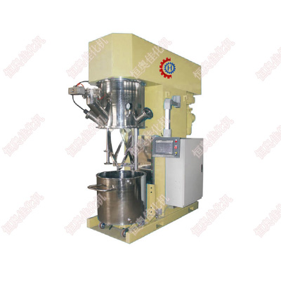 4、設備上裝有低速攪拌部件和高速分散部件,均采用變頻調速可根據不同工藝流程及 不同的粘度進行自我選擇。低速攪拌部件采用行星齒傳動,攪拌漿在公轉時也能自轉使 物料上、下及四周運動,使物料在很短時間內達到理想的混合效果。高速分散部件與行 星架一起公轉,同時高速自轉使物料受到強烈的剪切與分散混合,其效果為普通混合機 的幾倍。