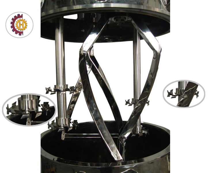 4、設(shè)備上裝有低速攪拌部件和高速分散部件,均采用變頻調(diào)速可根據(jù)不同工藝流程及 不同的粘度進(jìn)行自我選擇。低速攪拌部件采用行星齒傳動(dòng),攪拌漿在公轉(zhuǎn)時(shí)也能自轉(zhuǎn)使 物料上、下及四周運(yùn)動(dòng),使物料在很短時(shí)間內(nèi)達(dá)到理想的混合效果。高速分散部件與行 星架一起公轉(zhuǎn),同時(shí)高速自轉(zhuǎn)使物料受到強(qiáng)烈的剪切與分散混合,其效果為普通混合機(jī) 的幾倍。
